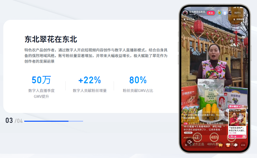 例如,东北农特产商家“翠花在东北”通过数字人直播季度GMV增长50万,粉丝增量超22%。中小商家无需高额投入,即可拥有与真人高度相似的虚拟导购员。