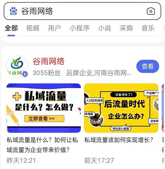 通过认证后的企业百家号,在手机端百度搜索企业昵称名称词就能在首页显示该账号的内容,且不用做任何优化,客户随时搜随时都能看见。